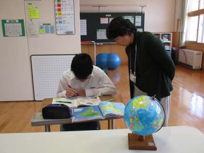 社会の授業では、地図帳を使いながら緯度・経度について学習しました。
