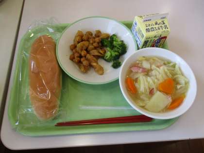 給食メニューと放送室 公開日 2023/05/15 更新日 2023/05/15 日々の活動から 5月15日(月) 給食メニューです。 米粉コッペパン 牛乳 鶏肉とひよこ豆のカレー風味 ゆでブロッコリー 野菜のスープ煮 放送当番の様子です。