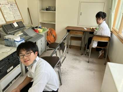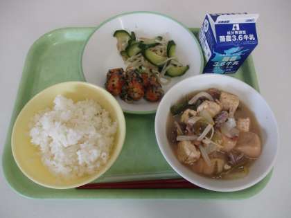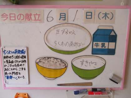 放送当番の様子です。 給食メニューです。 ごはん 牛乳 ちくわの南部揚げ 甘酢和え すきやき
