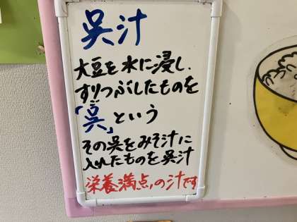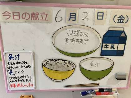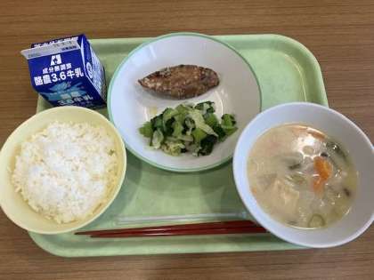 給食メニューです。 ごはん 牛乳 魚の竜田揚げ 小松菜ひたし 呉汁