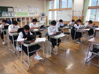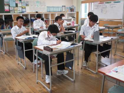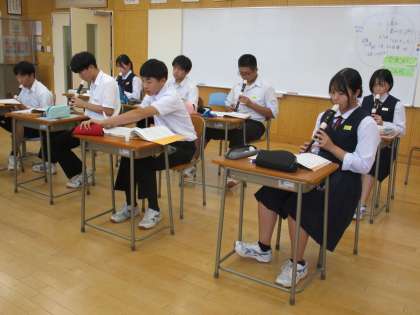 5時間目の授業の様子 公開日 2023/06/09 更新日 2023/06/09 日々の活動から 1年生は、保健体育で「食生活と健康」という内容の授業でした。 2年生は、英語で「おすすめの場所を紹介しよう」という内容の授業でした。 3年生は、音楽で「千の風になって」をアルトリコーダーで演奏していました。