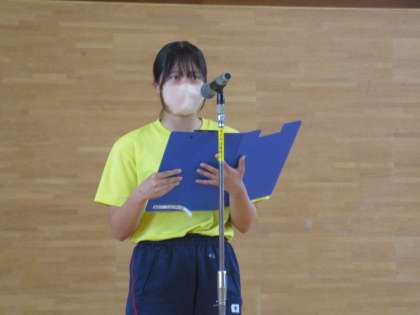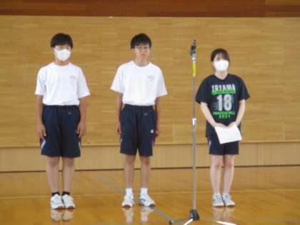 富山市中学校総合選手権大会・ボート部全国大会壮行会 1 公開日 2023/06/12 更新日 2023/06/12 日々の活動から 午後から、体育館で「富山市中学校総合選手権大会・ボート部全国大会壮行会」を行いました。 生徒会長の始めの挨拶 野球部、陸上競技部の意気込み紹介がありました。