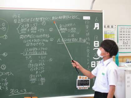 2年生は、連立方程式の利用の問題を生徒が説明していました。