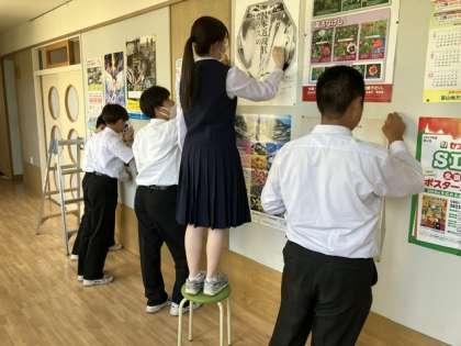 放課後の実践部の活動の様子 1 公開日 2023/06/19 更新日 2023/06/19 日々の活動から 環境実践部は、廊下の掲示物の刷新をしていました。 学習実践部は、お勧めの本紹介をしていました。 厚生実践部は、熱中症予防と虫歯予防のポスターをかいていました。