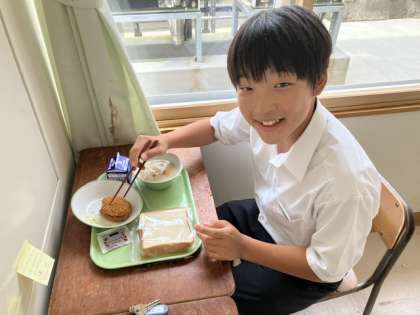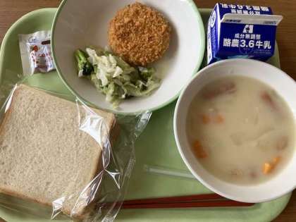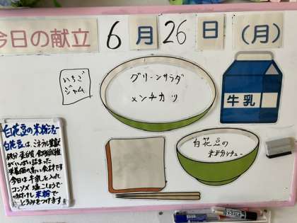 給食メニューと放送室 公開日 2023/06/26 更新日 2023/06/26 日々の活動から 給食メニューです。 食パン 牛乳 メンチカツ グリーンサラダ 白花豆の米粉シチュー いちごジャム 放送当番の様子です。