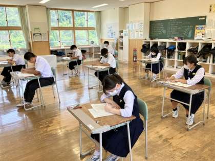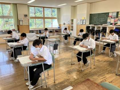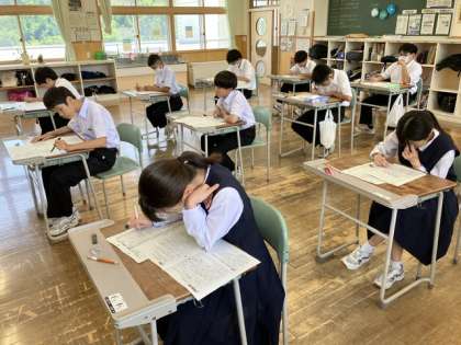 1時間目の授業の様子 公開日 2023/06/29 更新日 2023/06/29 日々の活動から 6月29日(木) 1年生は、音楽の期末考査に取り組んでいました。 2年生は、保健体育の期末考査に取り組んでいました。 3年生は、理科の期末考査に取り組んでいました