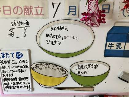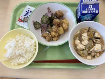 給食メニューです。 ごはん 牛乳 ほたてとじゃがいものごまからめ ゆかり和え 豆腐の野菜あんかけ 味付け小魚