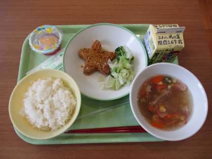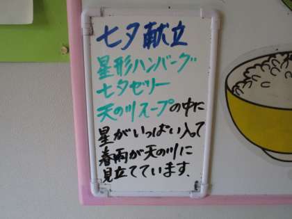 給食メニューです。 ごはん 牛乳 星形ハンバーグ そえ野菜 天の川スープ 七夕ゼリー