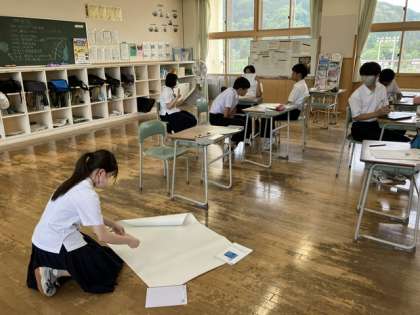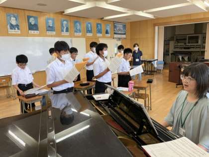 4時間目の授業の様子 公開日 2023/07/07 更新日 2023/07/07 日々の活動から 1年生は、音楽で歌の練習をしていました。 3年生は、楡の木タイムで体育大会のスローガンを考えたり、スローガンを作ったりしていました。