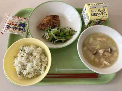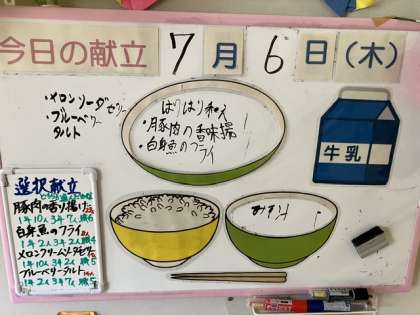 給食メニュー 公開日 2023/07/07 更新日 2023/07/07 日々の活動から 給食メニューです。 今日は、選択献立でした。 菜めし 牛乳 ◆豚肉の香り揚げ はりはり和え みそ汁 ○ブルーベリータルト 菜めし 牛乳 ◆白身魚のフライ はりはり和え みそ汁 ○メロンクリームソーダゼリー