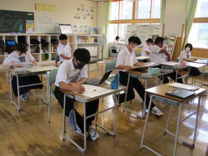 4時間目の授業の様子 公開日 2023/07/18 更新日 2023/07/18 日々の活動から 1年生は、保健体育でバドミントンの試合をしていました。 2年生は、英語で「朝美のレポートを読み、朝美が職業体験を通して考えたことを読み取ろう」という内容の授業でした。 3年生は、美術で、自画像を進めていました。
