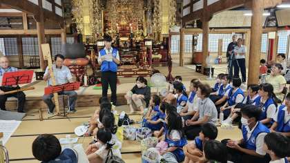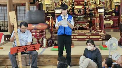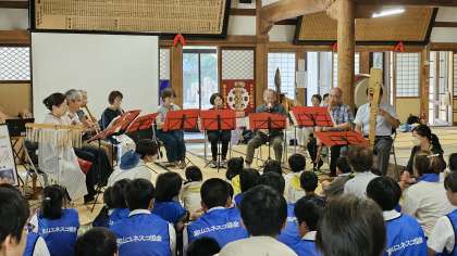 平和の鐘を鳴らそう in 上行寺その3 公開日 2023/07/25 更新日 2023/07/25 日々の活動から 平和の鐘を鳴らそう in 上行寺がはじまりました。 リコーダーアンサンブルのパレットの紹介を本校3年生が行いました。 とても心落ち着く素晴らしい演奏でした。