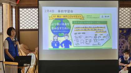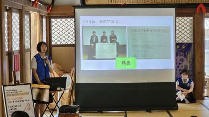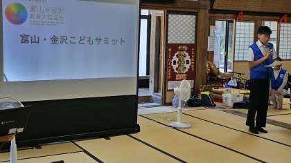 平和の鐘を鳴らそう in 上行寺その4 公開日 2023/07/25 更新日 2023/07/25 日々の活動から 本校3年生による体験発表です。 富山・金沢こどもサミットで学んだ成果の報告をしました。