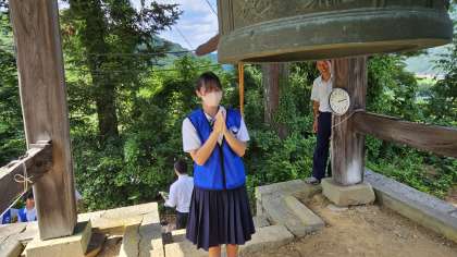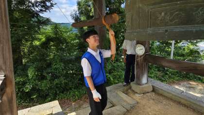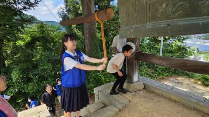 平和の鐘を鳴らしています! 手を合わせて、鳴らします。