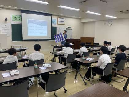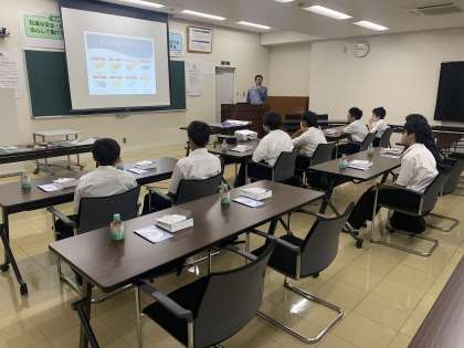 富山県中学生ものづくり教育事業の一環として、企業見学を実施しました。1年生が参加し、朝日印刷を訪問しました。まずは、会社の概要について説明を受けました。