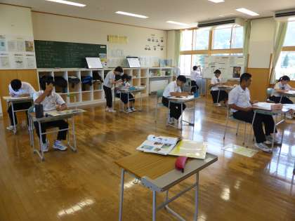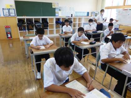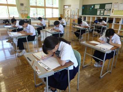 4時間目の授業の様子 公開日 2023/08/29 更新日 2023/08/29 日々の活動から 1年生は、保健体育で「体の発育・発達」という内容の授業でした。 2年生は、数学の夏休み明けテストをしていました。 3年生は、美術で自画像の制作を進めていました。