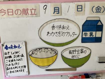給食メニューと放送室 公開日 2023/09/01 更新日 2023/09/01 日々の活動から 今日の給食は、 ごはん 牛乳 わかさぎのフリッター 香味和え 高野豆腐の卵とじ です。 放送室の様子です。