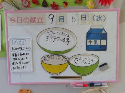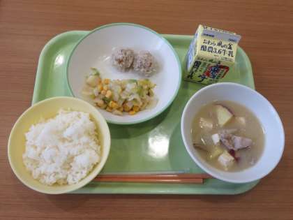 給食メニューです。 ごはん 牛乳 珍珠丸子 コーン和え さつま汁