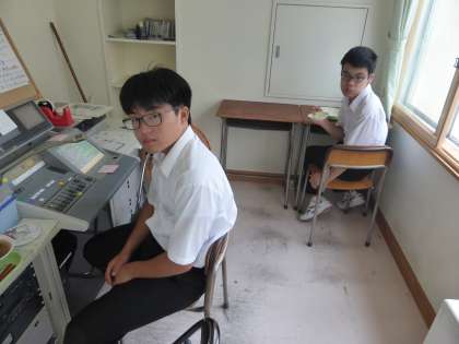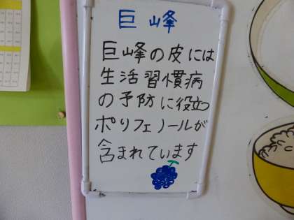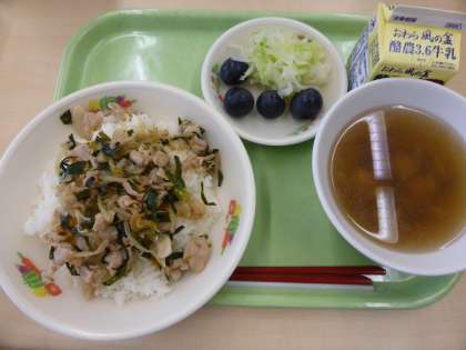 給食メニューです。 ごはん 牛乳 豚キムチ丼 ゆでキャベツ 茎わかめスープ 巨峰 放送当番の様子です。