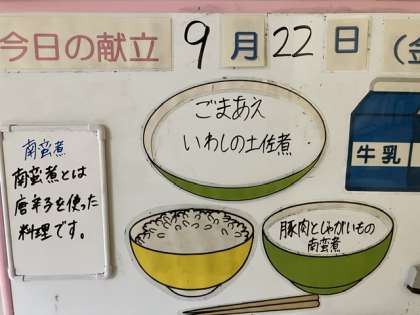 給食メニューと放送室の様子 公開日 2023/09/22 更新日 2023/09/22 日々の活動から 給食メニューです。 ごはん 牛乳 いわしの土佐煮 ごま和え 豚肉とじゃがいもの南蛮煮 放送室の様子です。 今日は生徒会選挙の立候補者による意見発表がありました。そのお世話を選挙管理委員がしていました。
