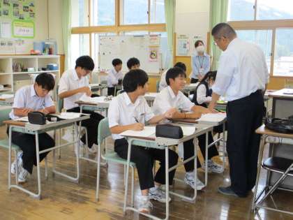 4時間目の授業の様子 公開日 2023/09/26 更新日 2023/09/26 日々の活動から 1年生は、保健体育でバスケットボールのシュート練習をしていました。 2年生は、数学で連立方程式のグラフによる解法を学んでいました。 3年生は、美術で自画像の色塗りをしていました。