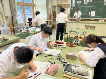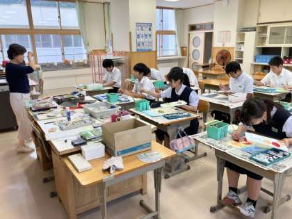 2年生は、美術でメッセージを伝えるポスターの色塗りをしていました。
