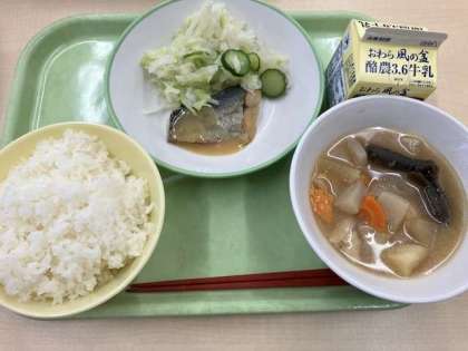 給食メニューです。 ごはん 牛乳 鰆の西京焼き きざみ和え 炊き合わせ 放送当番の様子です。