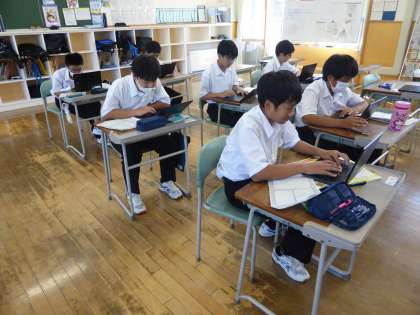 1年生は、英語で「自己紹介ポスターをかこう」という内容の授業でした。