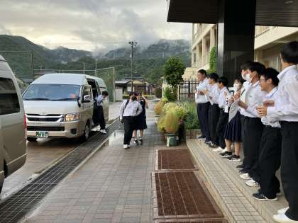 2年生校外学習 14 公開日 2023/10/05 更新日 2023/10/05 日々の活動から タクシー2台に分かれて、2年生が帰ってきました。 音楽室で自主学習をしていた生徒が出迎えてくれました。 出迎えてくれた生徒に手を振る姿が見られました。
