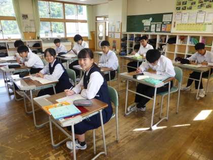 2年生は、数学で1次関数の復習をしていました。 3年生は、社会で模擬裁判の動画を見ていました。