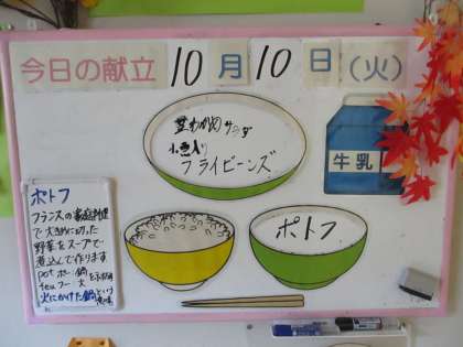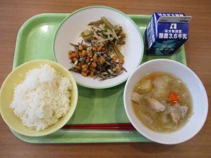給食メニューです。 ごはん 牛乳 小魚入りフライビーンズ 茎わかめサラダ ポトフ 放送当番の様子です。