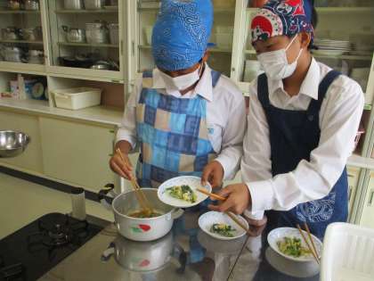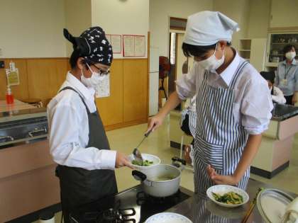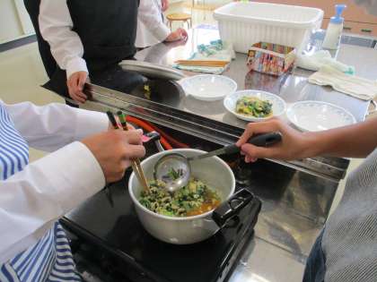 5時間目の授業の様子 2 公開日 2023/10/11 更新日 2023/10/11 日々の活動から メニューは「青菜の卵とじ」でした。 「洗う、切る、煮る、盛りつける」どの工程も緊張してやっていました。
