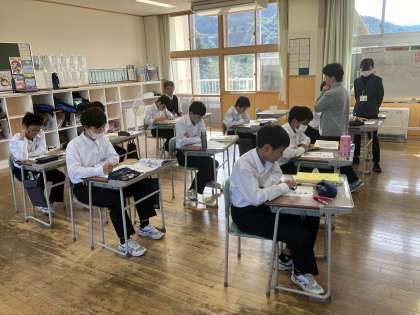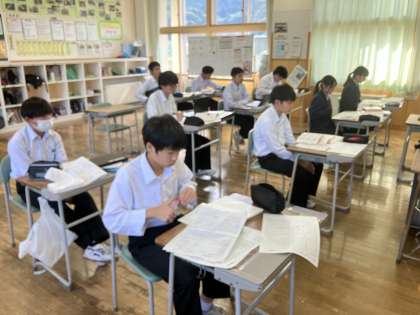 2時間目の授業の様子 公開日 2023/10/13 更新日 2023/10/13 日々の活動から 1年生は、美術で「オノマトペで表現しよう」という内容の授業でした。 2年生は、国語でテストの見直しをしていました。 3年生は、数学で「相似な図形の相似比と面積比」という内容の授業でした。