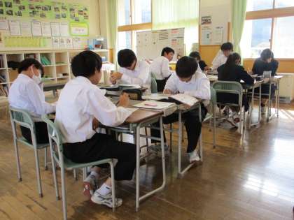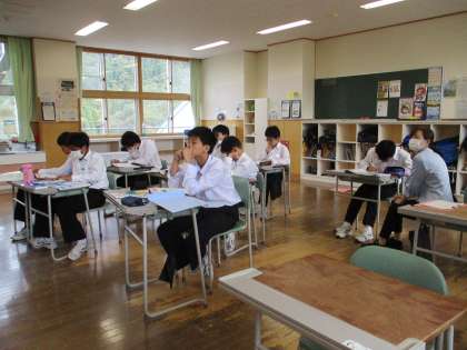 2時間目の授業の様子 公開日 2023/10/16 更新日 2023/10/16 日々の活動から 1年生は、保健体育で「呼吸器官・循環器官の発育、発達」という内容の授業でした。 2年生は、英語で、テストの見直しをしていました。 3年生は、楡の木タイムで学習発表会の練習をしていました。