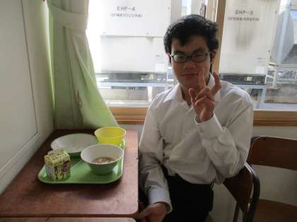 給食メニューです。 ごはん 牛乳 あっさりチキン ゆかり和え 卵とじ 放送当番の様子です。