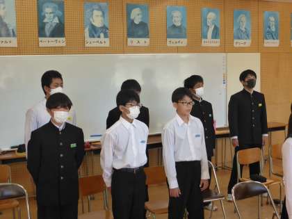 1時間目の授業の様子 公開日 2023/10/25 更新日 2023/10/25 日々の活動から 10月25日(水) 1限は、音楽室で合同音楽でした。 学習発表会に向けて合唱の追い込み練習をしていました。