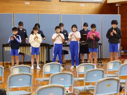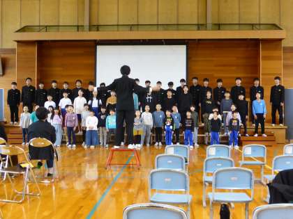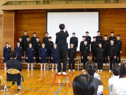 小中合同学習発表会 5 公開日 2023/10/28 更新日 2023/10/28 日々の活動から 2曲目の合唱の様子です。 3曲目は、小学生とも一緒に「もみじ」を歌いました。一部楽器の演奏もありました。