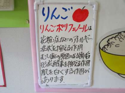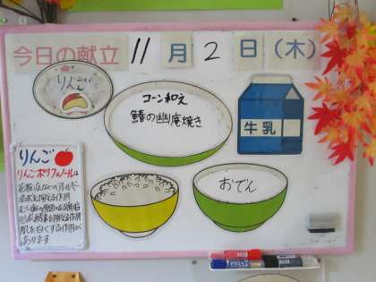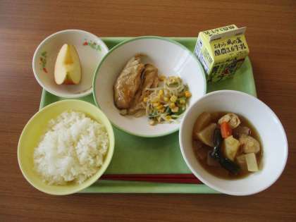 給食メニューです。 ごはん 牛乳 鰆の幽庵焼き コーン和え おでん りんご