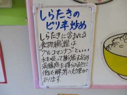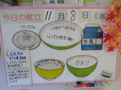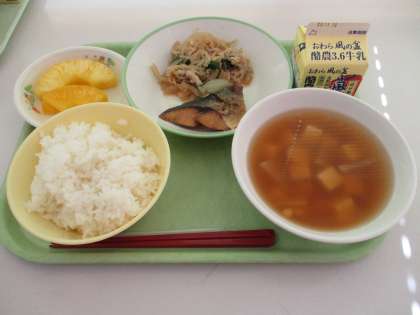 給食メニューです。 ごはん 牛乳 ふくらぎの西京焼き しらたきのピリ辛炒め 白玉汁 パインアップル