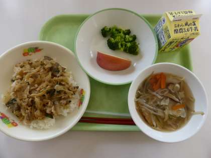給食メニューです。 ごはん 牛乳 スタミナレバー丼 ゆでブロッコリー ワンタンスープ りんご