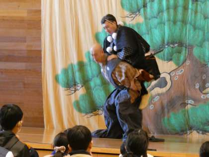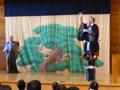 2・3時間目の授業の様子 4 公開日 2023/11/22 更新日 2023/11/22 日々の活動から 2番目の演目の「柿山伏」の様子です。 喉が渇いた山伏が無断で柿の木に登って柿を食べている所に畑の持ち主が来て、動物のマネをしてごまかしていたのですが・・・というお話でした。