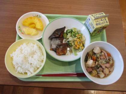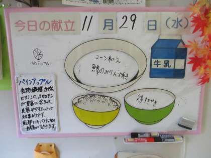 給食メニューと放送室 公開日 2023/11/29 更新日 2023/11/29 日々の活動から 給食メニューです。 ごはん 牛乳 鯵のみりん焼き コーン和え 鶏すきやき パインアップル 放送当番の様子です。