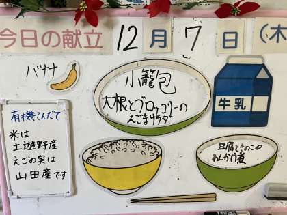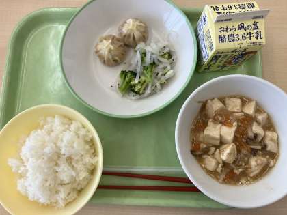 ごはん(有機米) 牛乳 小籠包 大根とブロッコリーのえごまサラダ 豆腐ときのこのあんかけ煮
