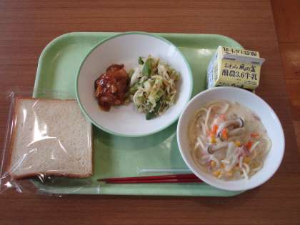 食パン(減) 牛乳 照焼きチキン 切干大根のサラダ クリームスパゲッティ