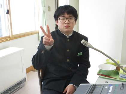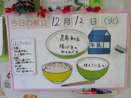 給食メニューです。 ごはん 牛乳 揚げ魚のみぞれだれ 昆布和え はくさいなべ 放送当番の様子です。