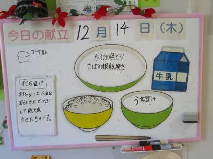 給食メニューと放送室 公開日 2023/12/14 更新日 2023/12/14 日々の活動から 給食メニューです。 ごはん 牛乳 さばの銀紙焼き かぶの色どり 打ち豆汁 ヨーグルト 放送当番の様子です。