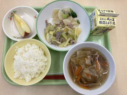 給食メニューと放送室の様子 公開日 2024/01/10 更新日 2024/01/10 日々の活動から 3学期最初の給食のメニューです。 ごはん 牛乳 豚肉の塩こうじ炒め かぶの色どり ワンタンスープ りんご 放送当番の様子です。