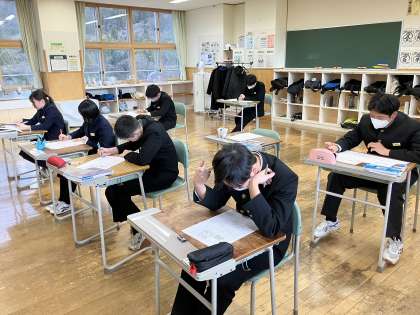 1時間目の授業の様子 2 公開日 2024/01/12 更新日 2024/01/12 日々の活動から 2年生は、数学で「平行四辺形になるための条件」を使った証明問題に取り組んでいました。 3年生は、社会でした。