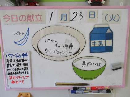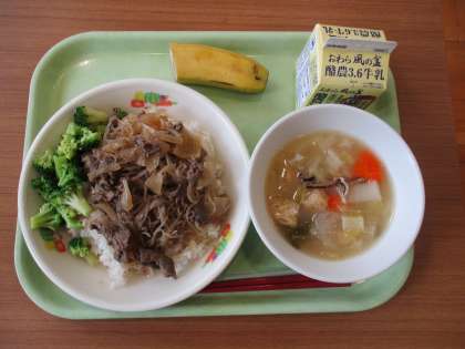 給食メニュー 公開日 2024/01/23 更新日 2024/01/23 日々の活動から 給食メニューです。 今週(1/22〜1/26)は学校給食週間で、テーマは「オリンピック・パラリンピック応援給食〜めざせ未来のアスリート〜」です。 今日の献立のテーマは、筋力アップです。 麦ごはん 牛乳 パワーぎゅうぎゅう丼 ゆでブロッコリー 具だくさん汁 バナナ