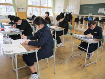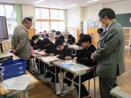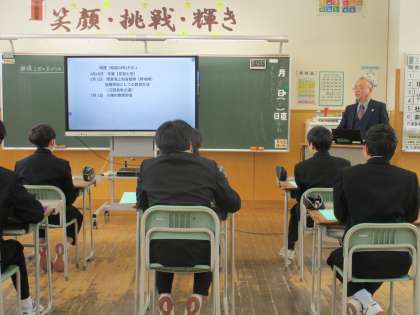 3時間目の授業の様子 公開日 2024/02/06 更新日 2024/02/06 日々の活動から 1年A組は、数学でした。 2年生は、外部から講師に来ていただいて平和学習をしていました。 3年生は、英語でした。